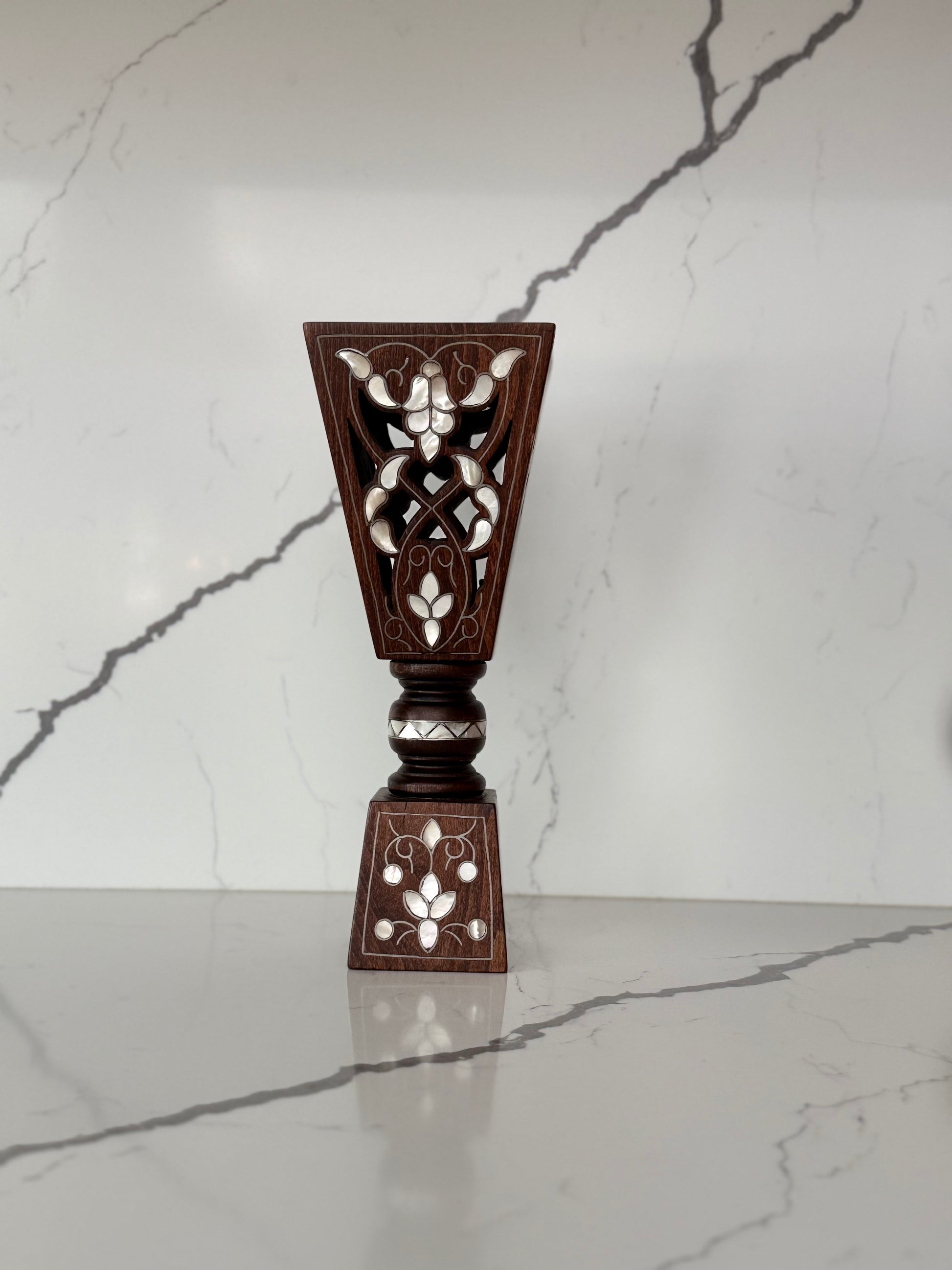 “A wooden vase decorated with mother-of-pearl inlay.”