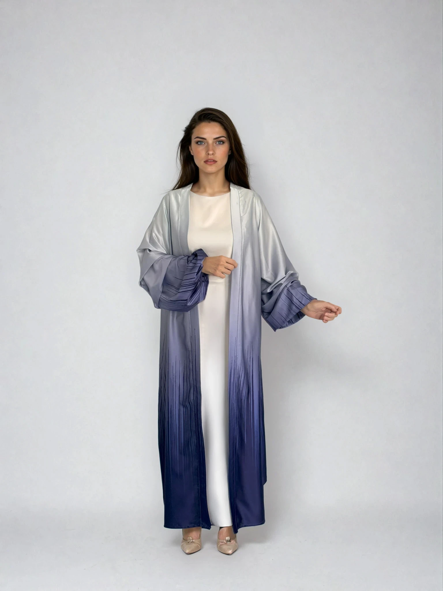 Abaya with bell sleeves cinched at the wrist. This abaya begins with a lighter shade and flows into a darker shade of blue or green. Wear this abaya for your next event or gathering!